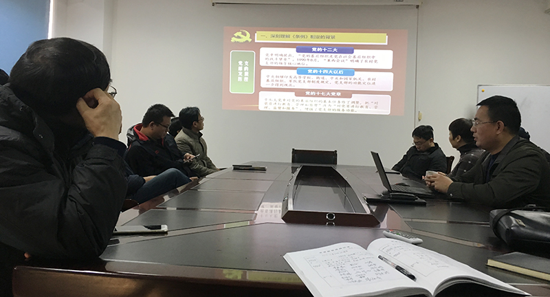 李海峰介绍了《条例》制定的背景、《条例》颁发的重要意义和《条例》制定工作遵循的原则,与全体党员一起逐章逐条学习了《条例》的基本内容,并结合支部工作从党支部的组织设置、基本任务、工作机制、组织生活等方面对《条例》内容进行了深入解读。他认为,党的十八大以来,以习近平同志为核心的党中央高度重视党支部建设,制定和实施《条例》,是推动全面从严治党向基层延伸的重要举措,为新时代党支部建设提供了基本遵循。《条例》的制定和实施,对于加强党支部的建设具有重要的意义。他强调,全体党员要深入领会《条例》精神,全面学习《条例》基本内容,切实增强执行《条例》的思想自觉和行动自觉。