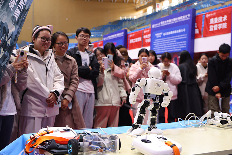 开幕式结束后,华为技术有限公司、科大讯飞股份有限公司、中国惠普有限公司、联想(北京)有限公司等9家知名科技企业和网络空间安全与计算机学院/计算机教学部、物理科学与技术学院、电子信息工程学院、质量技术监督学院等校内单位,集中展示了智能算力设备、无介质空气屏、大模型实训箱等60余种前沿科技产品和大学生创新作品。展示现场还设置了数字素养与技能有奖竞答环节,吸引了大量学生参与互动,零距离感受智能科技的独特魅力。