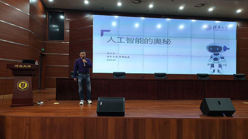 10月18日,河北大学第九届计算机文化节暨“周末专家河北行”人工智能专题报告会在七一路校区图书馆报告厅举办。清华大学长聘教授、博士生导师、人工智能通识教育研究中心主任马少平应邀做报告,报告会由网络空间安全与计算机学院副院长邢红杰主持,500余名师生现场聆听学习。